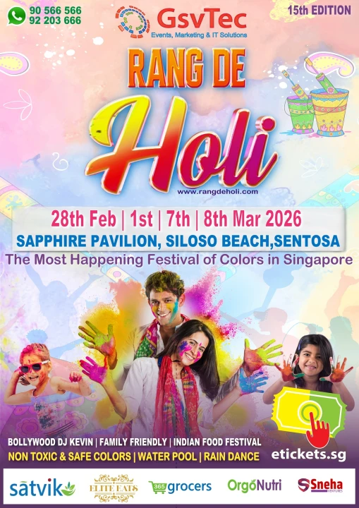 The most celebrated Indian Festival of Colors in Singapore Spend a day with friends and family for a culturally rich entertainment, Lots of entertaining activities like DJ music street food ,drinks and lots of networking and fun